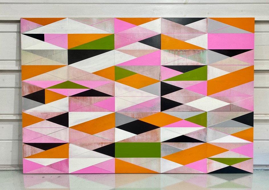 Working from her West London studio, Jodie focuses on familiar objects, capturing elements of their two dimensional form and experimenting with scale and repetition to create energetic discordant patterns.