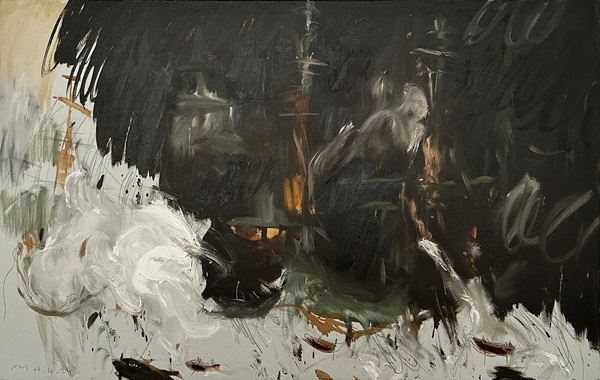 Philip examines the form and lines of this often chaotic subject matter, and in doing so creates a new kind of landscape painting that focuses on transitions and the constant flux of everyday life. These are not typical nature paintings in that they convey a sense of chaos and unrest, using erratic brushstrokes, paint drips and text to achieve this unsettling yet exciting effect.